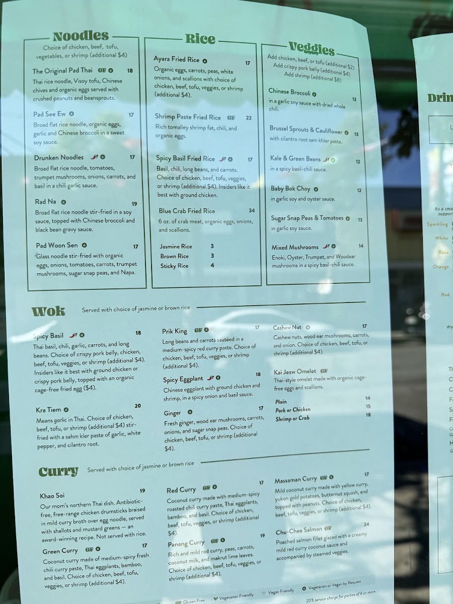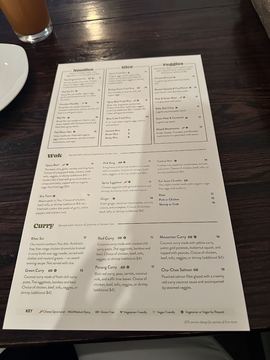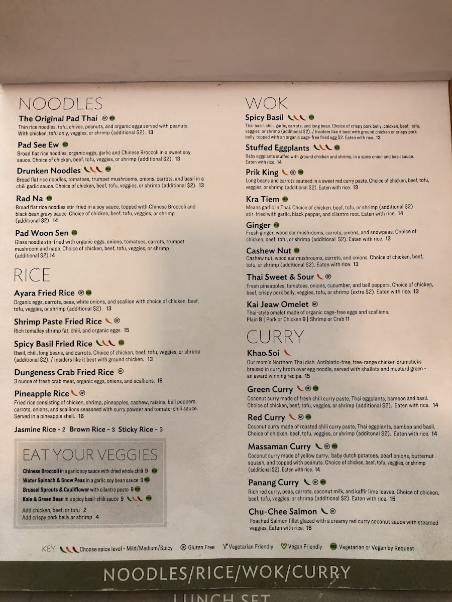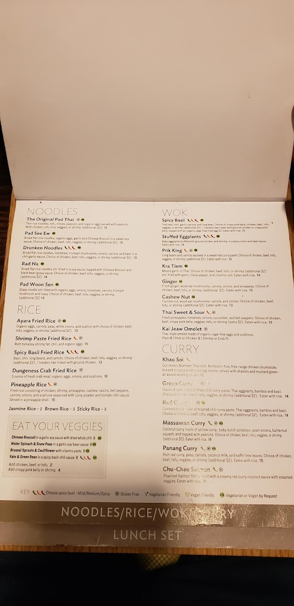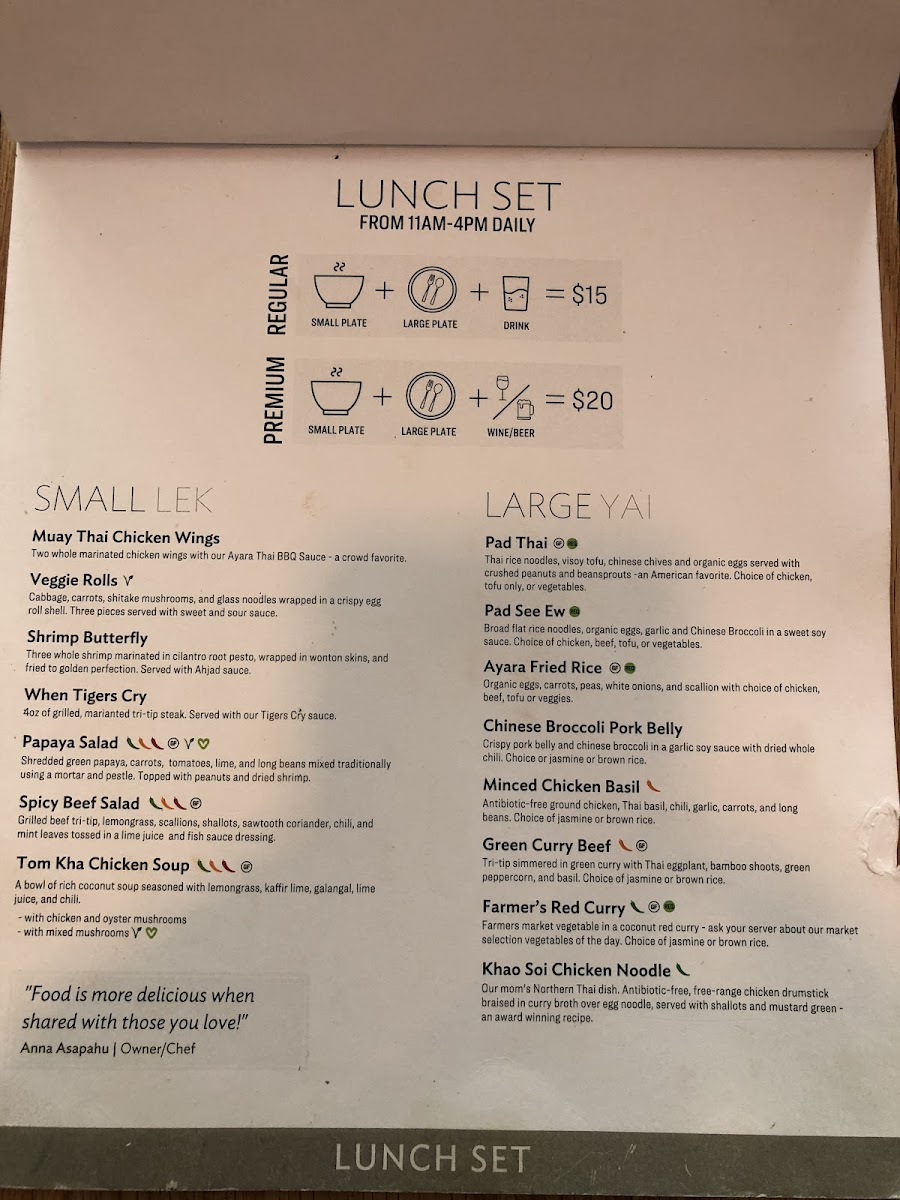 Lunch service is to-go/patio dining only. The food is worth the breezy patio-table experience though! I’ve gotten the pad see ew every time, and often the lunch kit with the “when tigers cry” beef appetizer/small plate to start. Perfect name! Pro tip: order ahead online for lunch and it’ll be ready when you arrive. Most things take about 15 minutes to come out.
